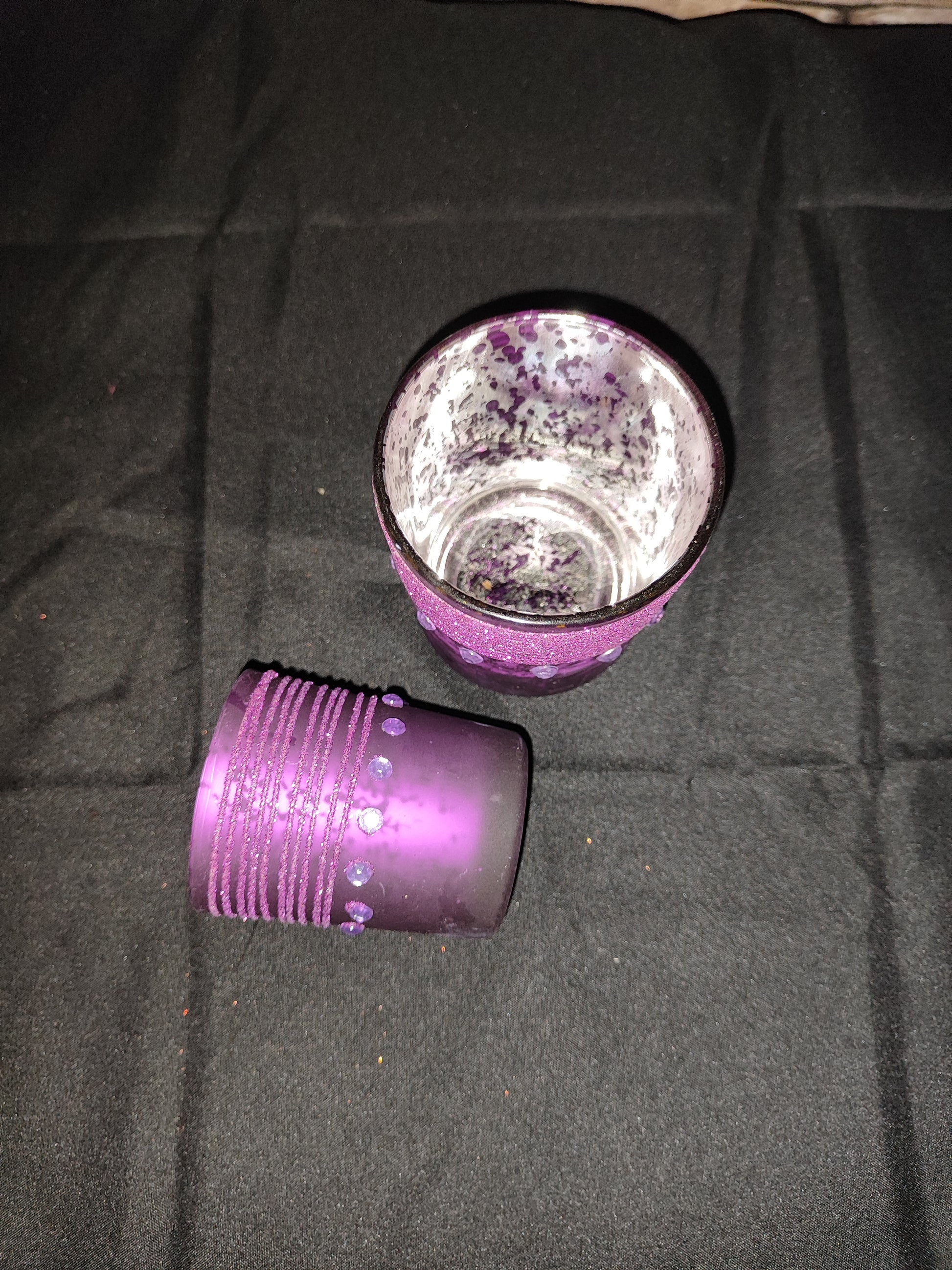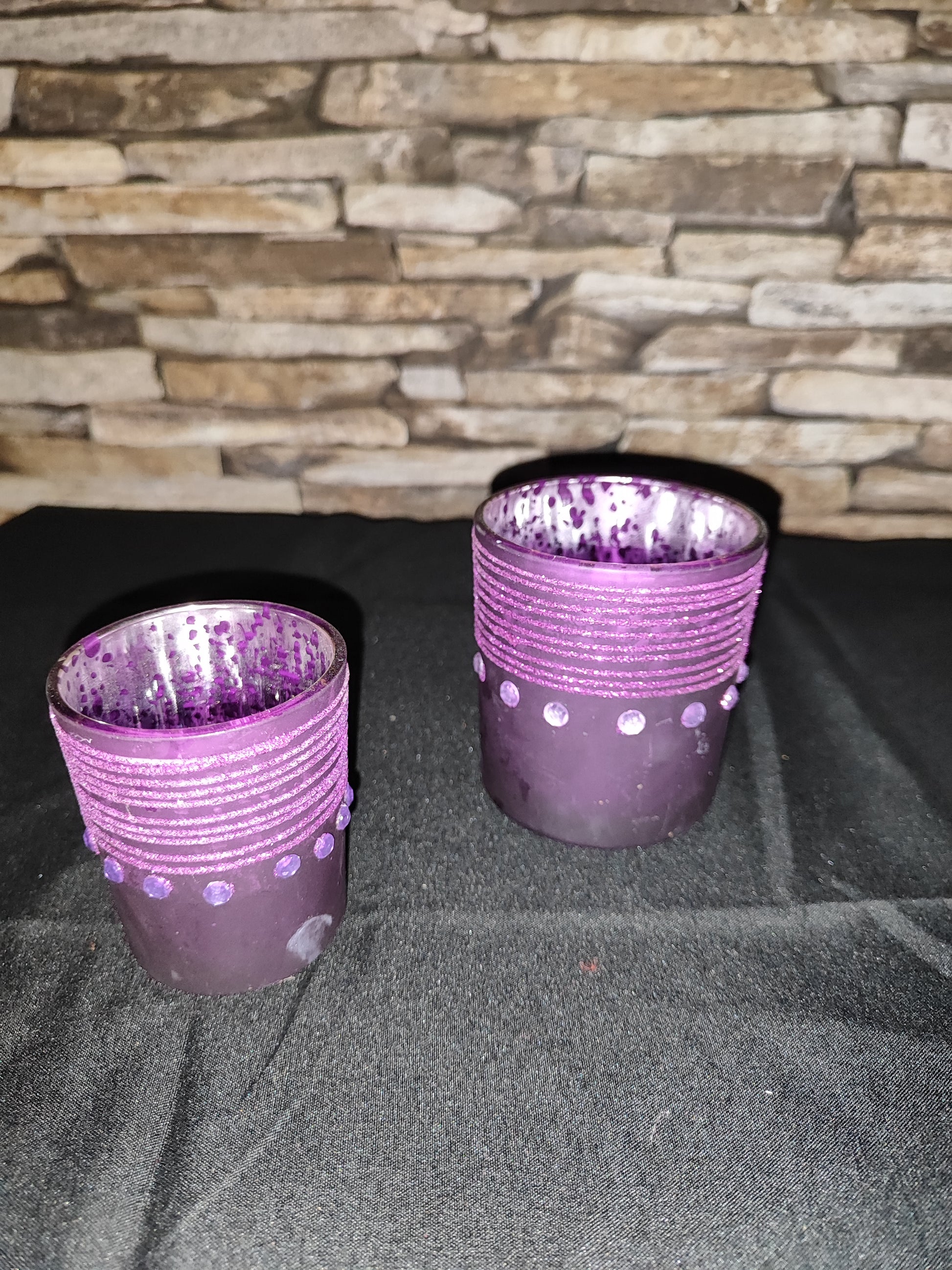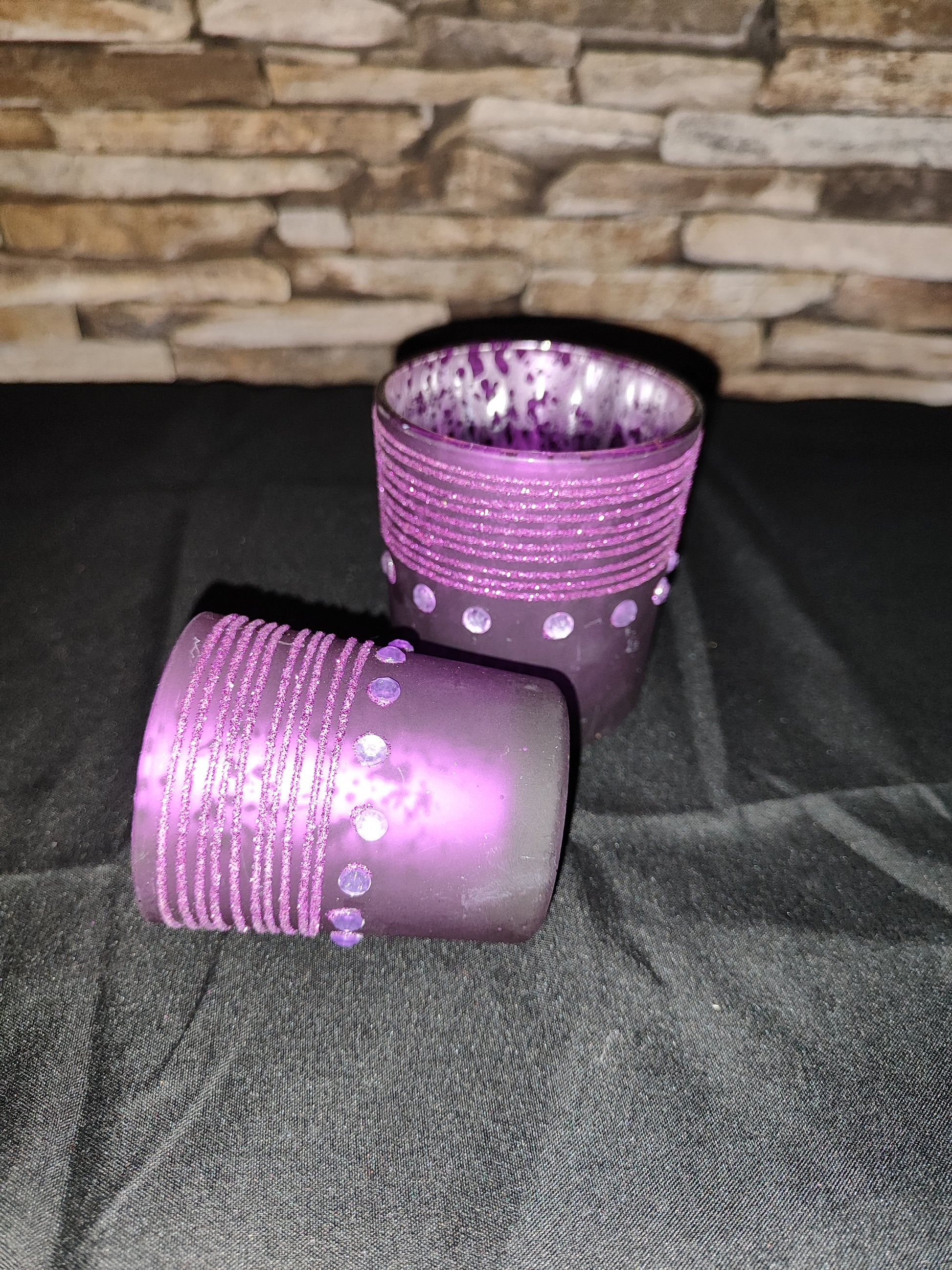 2er Set Teelichtgläser, Lila mit Steinen und Glitzer
