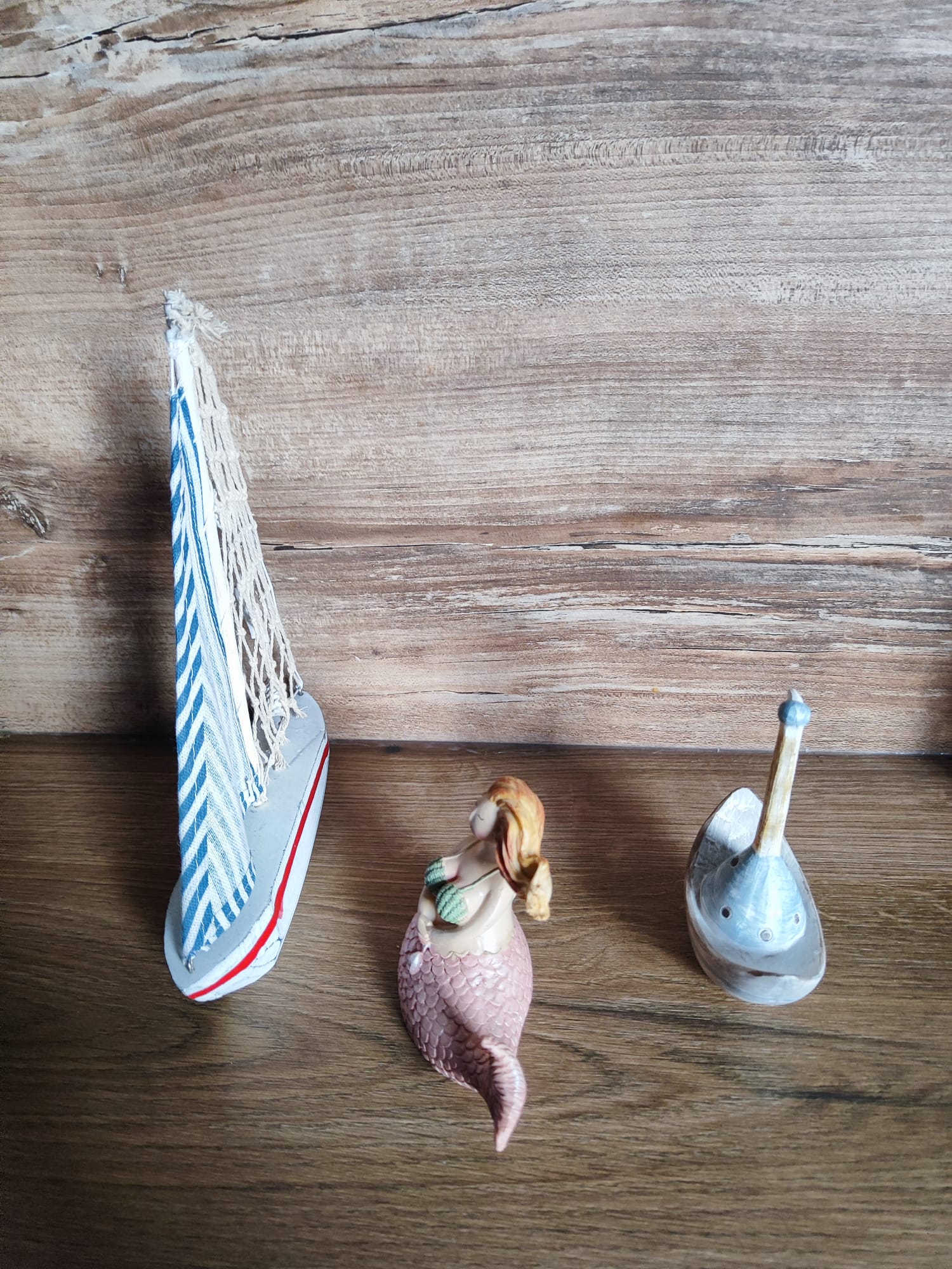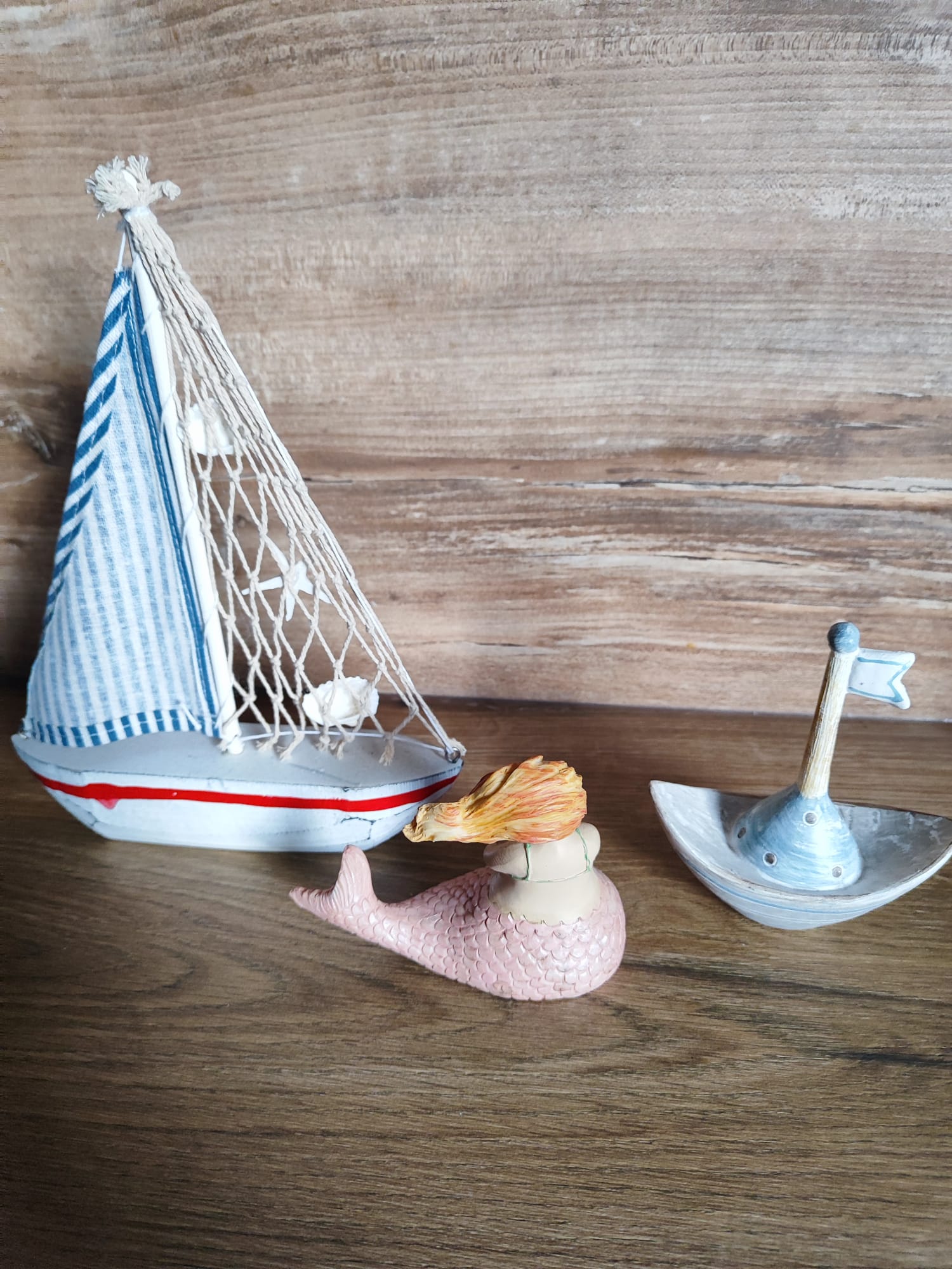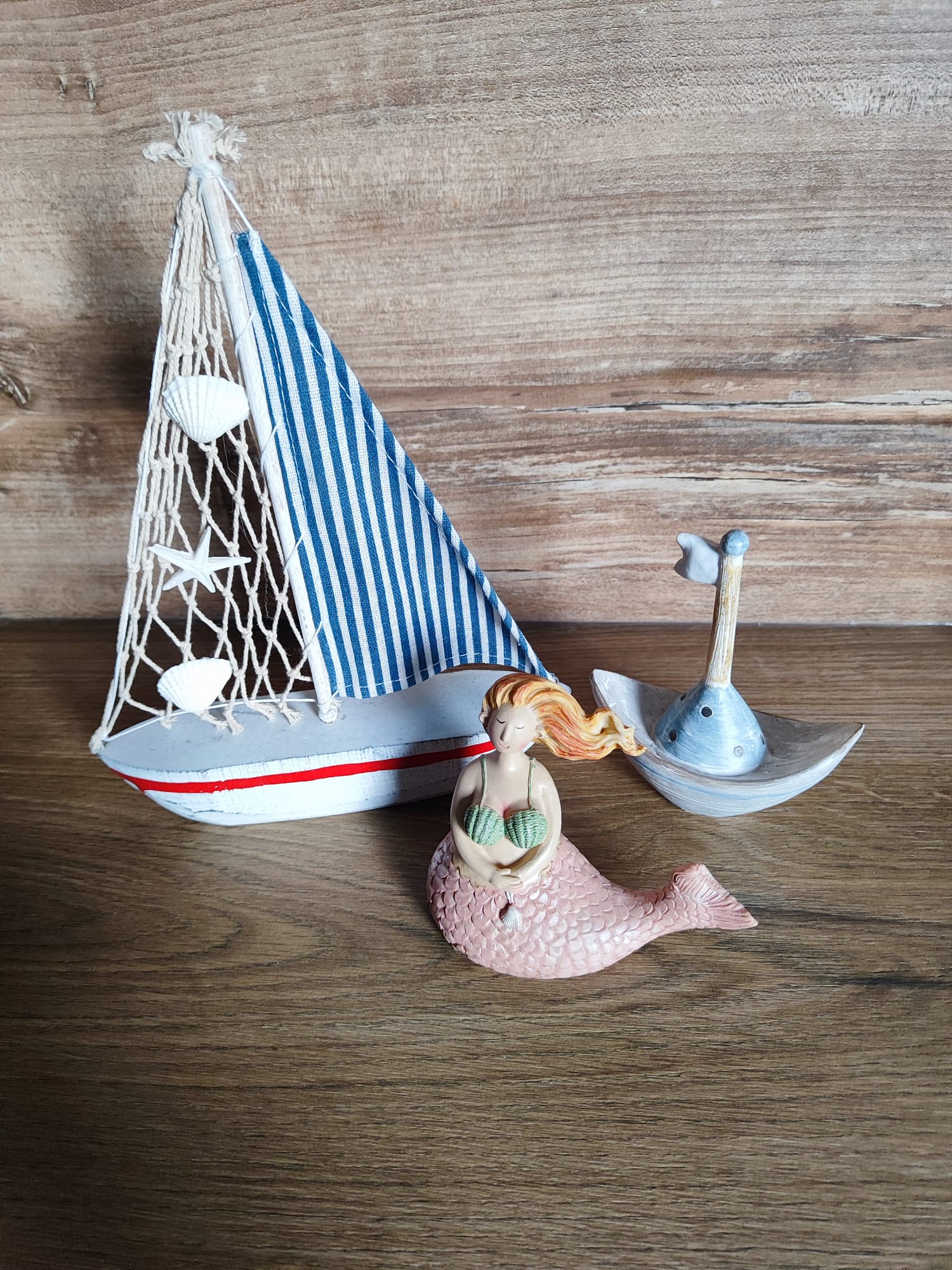 - 3er Set bestehend aus Holzschiff, Meerjungfrau, Keramikschiff